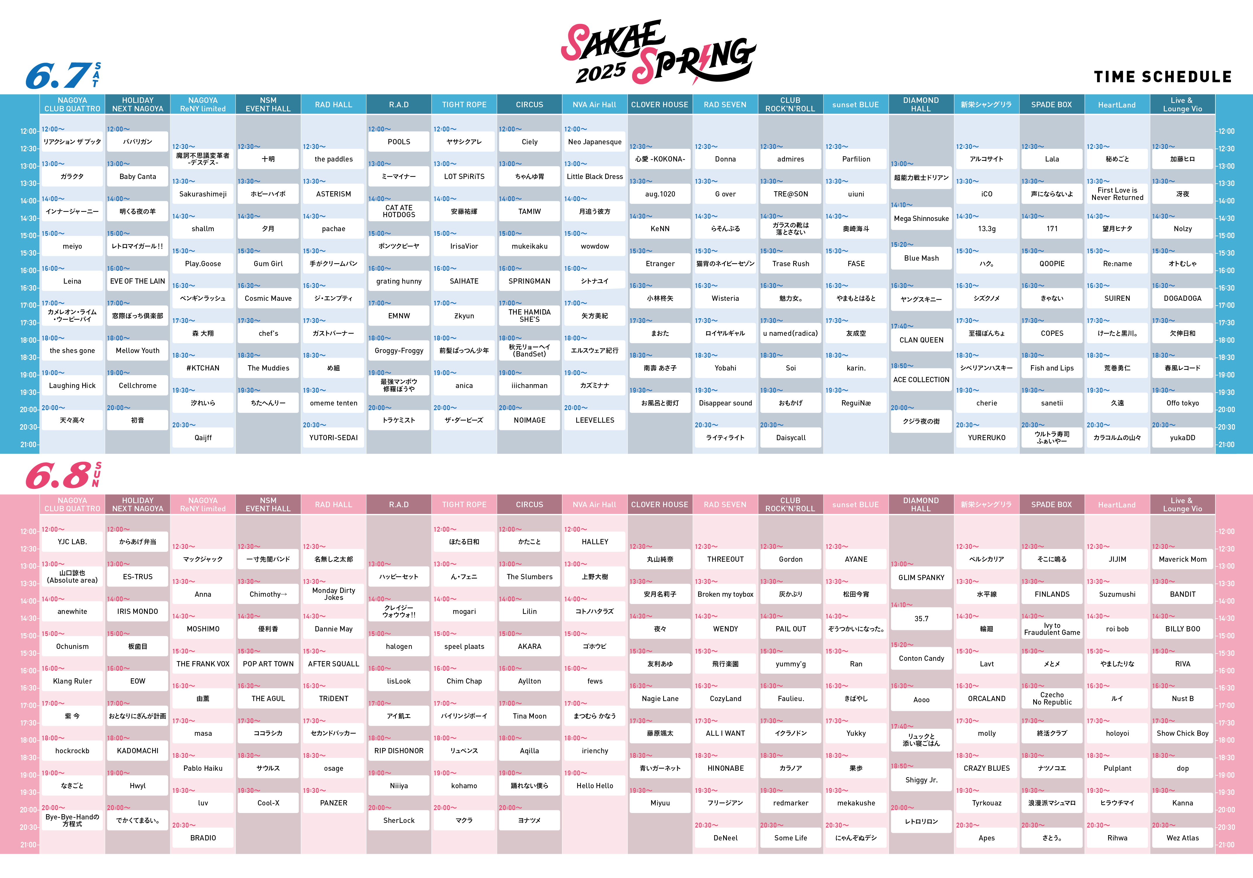 会場:DIAMOND HALL / NAGOYA ReNY limited / NAGOYA CLUB QUATTRO / RAD HALL / SPADE BOX / HOLIDAY NEXT NAGOYA / 新栄シャングリラ / R.A.D / RAD SEVEN / CLUB ROCK'N'ROLL / Live & Lounge Vio / TIGHT ROPE / CIRCUS / HeartLand / CLOVER HOUSE / sunset BLUE / NSM EVENT HALL / NVA Air Hall